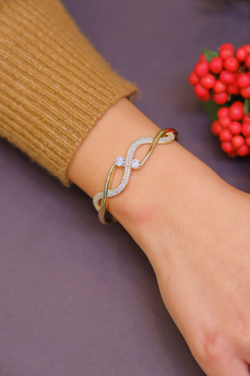 Akışkan formu ve merkezde konumlanan taş detayıyla zarif bir denge sunan bu kelepçe, modern ve feminen bir duruş sergiler. Kıvrımlı yapısı bilekte yumuşak bir geçiş oluştururken, taşların ışıltısı tasarıma premium bir karakter kazandırır. Tek başına şık bir görünüm sunar, farklı kelepçelerle kombinlendiğinde güçlü bir stil tamamlayıcısı olur.
