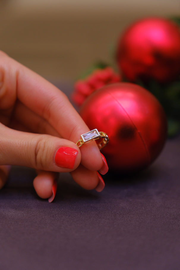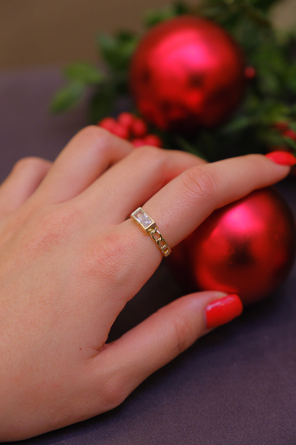 Baget kesim dikdörtgen taş detayı ve zarif zincir formundaki tasarımıyla modern ve şık bir görünüm sunar. Minimal ama karakterli duruşuyla hem günlük kullanımda hem de özel kombinlerde rahatlıkla tercih edilebilir.
