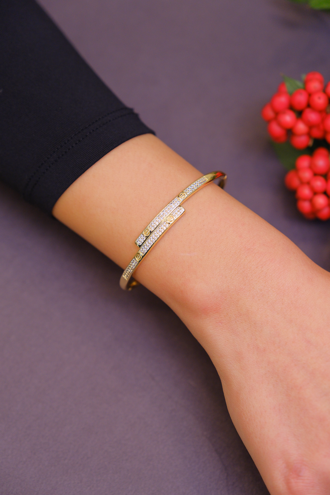 Paralel ilerleyen çift hat formu ve ince taş detaylarıyla modern ve dengeli bir görünüm sunar. Simetrik tasarımı bilekte zarif bir duruş oluştururken, sade ama dikkat çekici yapısıyla günlük ve şık kombinlere kolayca uyum sağlar. Tek başına güçlü bir stil sunar, diğer kelepçelerle birlikte kullanıldığında modern bir bütünlük oluşturur.