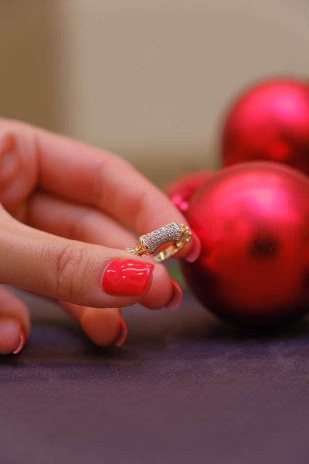 Ortası silindir formda taşlı detayıyla modern ve şık bir görünüm sunar. Dengeli ve sade tasarımı sayesinde günlük kullanıma uygundur; minimal ama dikkat çekici bir modeldir.