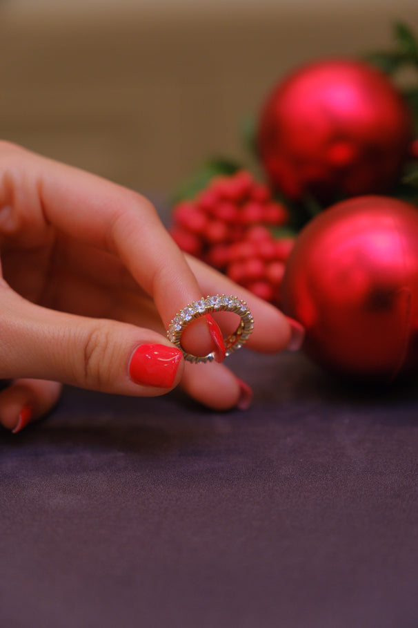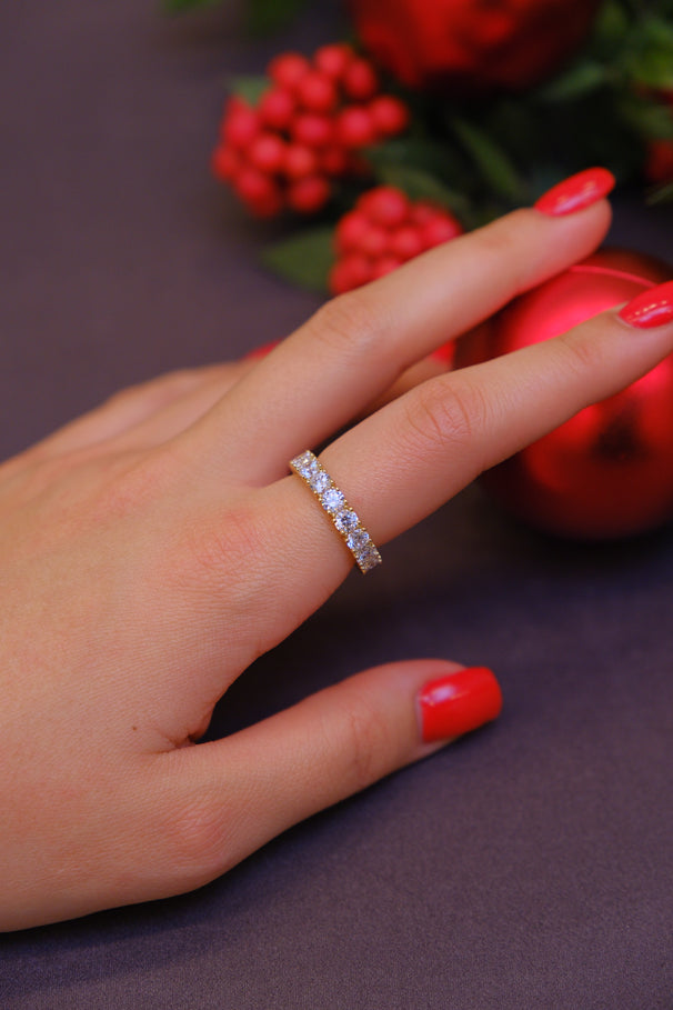 Tam tur dizilmiş parlak taşlarıyla zarif ve şık bir duruş sunar. İnce formu sayesinde tek başına sade bir şıklık yaratır, diğer yüzüklerle birlikte kullanıldığında ise güçlü bir tamamlayıcı olur. Günlük kullanıma ve özel anlara uygundur.