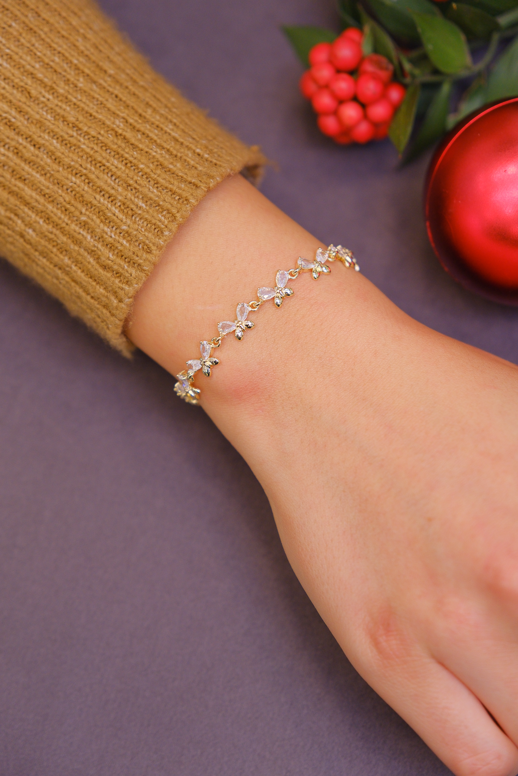 Kelebek figürlü taş detaylarıyla bilekte zarif ve dikkat çekici bir görünüm oluşturur. İnce yapısı sayesinde günlük kullanıma uygundur; tek başına kullanıldığında şık bir etki yaratırken, diğer zincir bilekliklerle kombinlendiğinde modern ve premium bir stil tamamlayıcısı olur.