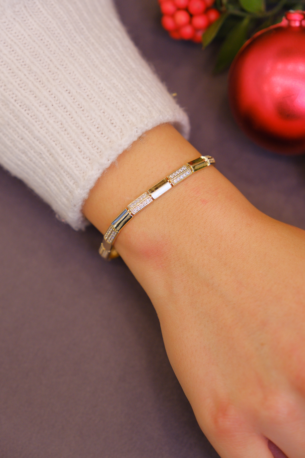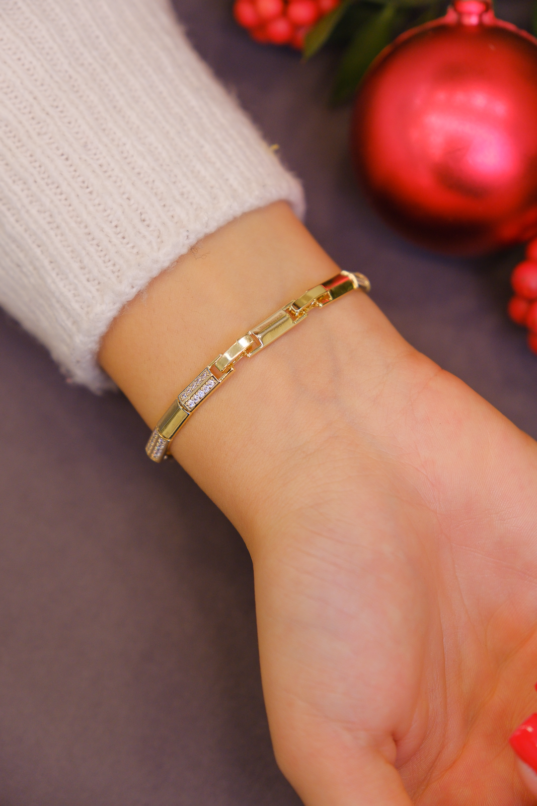 Düz ve taşlı geçiş detaylarıyla tasarlanan Parlak hat bileklik, modern ve dengeli bir şıklık sunar. Günlük kullanım için idealdir, tek başına veya kombinlenerek rahatlıkla kullanılabilir.