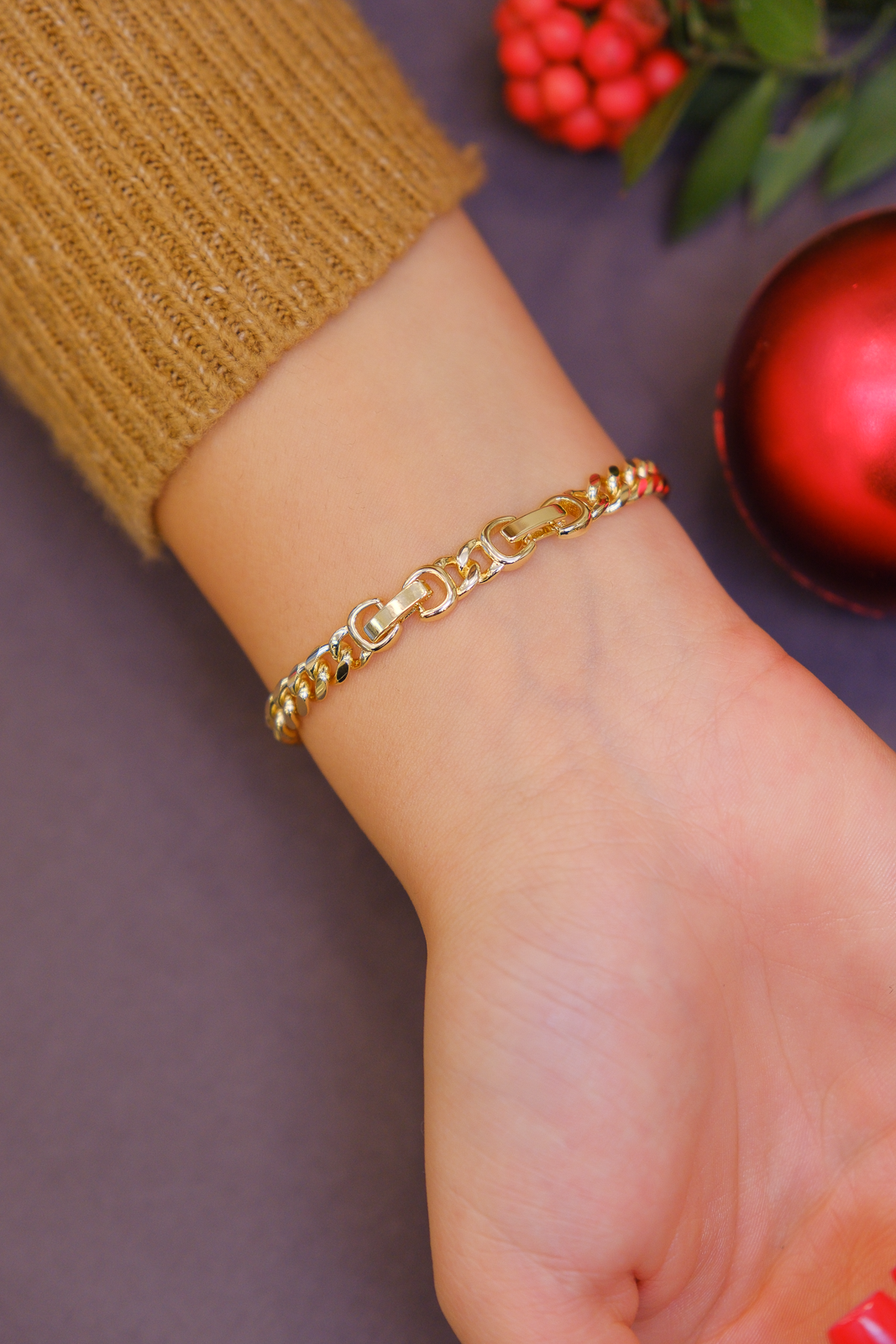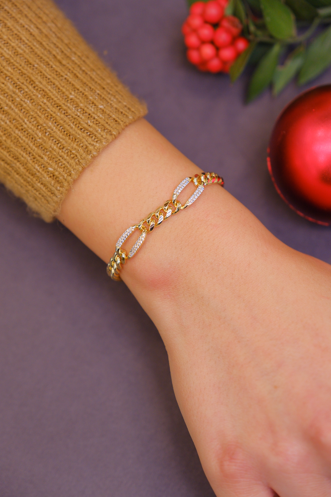 Taşlı halka detaylarıyla zincir formunu modern ve şık bir çizgide buluşturur. Dengeli ve güçlü tasarımı sayesinde bilekte premium bir duruş sunar. Günlük kombinlerde dikkat çekerken özel günlerde tek başına yeterli şıklık sağlar.