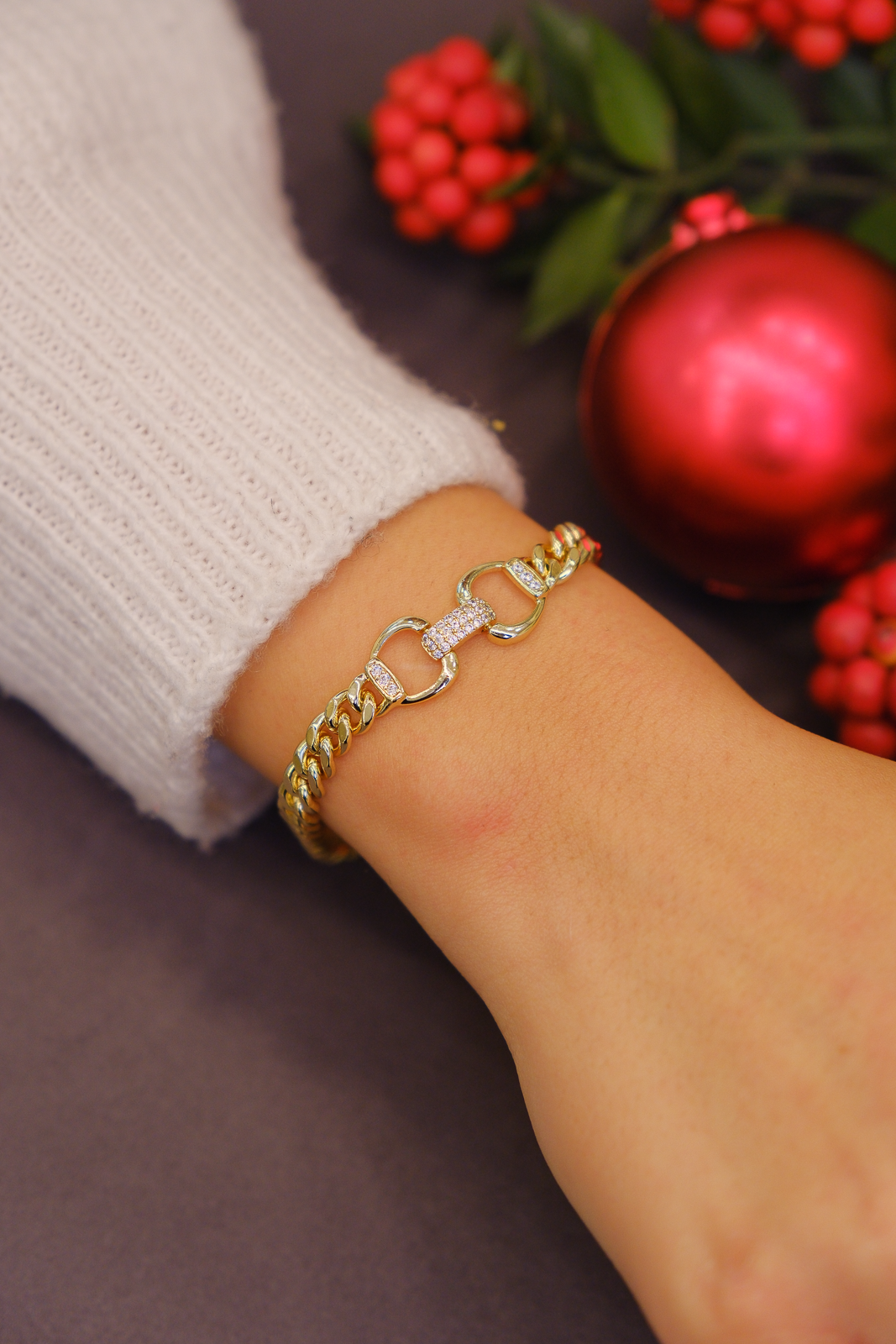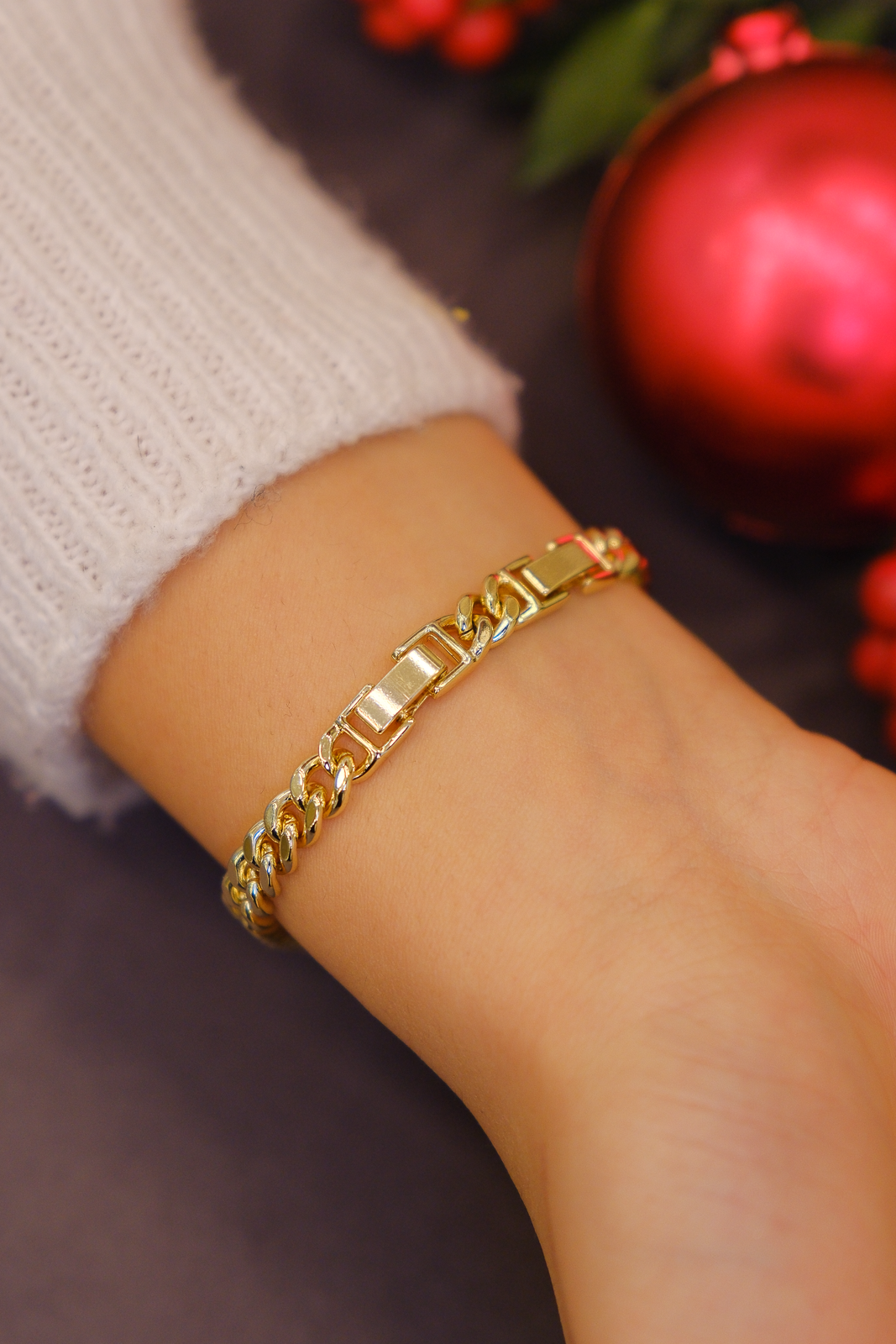 Modern zincir yapısı ve zirkon taşlı kilit detayıyla öne çıkan bu gold bileklik, güçlü ve şık bir stil sunar. Parlak yüzeyiyle dikkat çekerken sade tasarımı sayesinde günlük kombinlerden özel davetlere kadar her ortamda rahatlıkla kullanılabilir. Güvenli kilit yapısı ile konforlu ve sağlam bir kullanım sağlar.